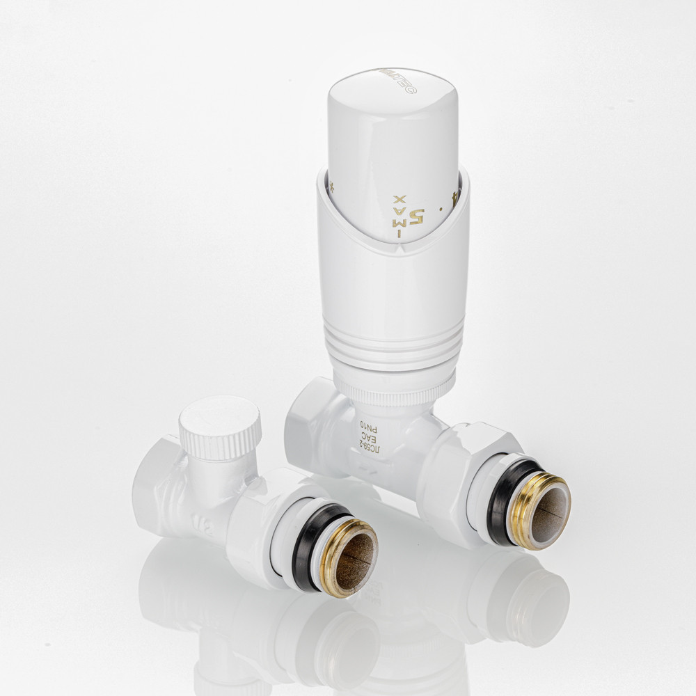 Клапаны и термоголовка комплекта выполнены в белом цвете.