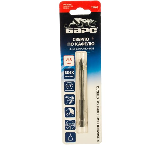 Сверло по керамической плитке 8 мм, крестовая пластинка, шестигранный хвостовик Барс