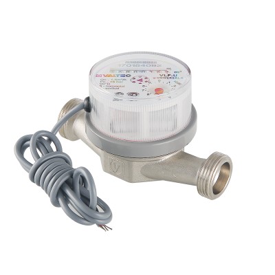 (VLF-15U-IL) Водосчетчик универсальный – для измерения расхода холодной и горячей воды, главным образом – в квартирах. Условный диаметр модели – 1/2"; номинальный расход воды – 1,5 куб. м/ч. Длина прибора – 80 мм. Резьба присоединительных патрубков – 3/4".