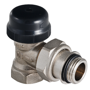(VT.037.N) Угловой радиаторный термостатический клапан VT.037 предназначен для автоматического или ручного регулирования расхода теплоносителя через отопительный прибор водяной системы отопления с рабочей температурой до 110 °С и рабочим давлением до 1,0 МПа включительно. Клапан соответствует требованиям стандарта EN 215, часть 1 и ГОСТ 30815. Отличительной особенностью радиаторного клапана VT.037 является наличие в его конструкции втулки предварительной настройки (Kv = 0,1–0,6), которая позволяет производить гидравлическую балансировку приборов в двухтрубных системах водяного отопления. Таким образом клапан объединяет в себе функции термостатического регулирования и монтажной настройки, что позволяет отказаться от использования дополнительной настроечной арматуры (как правило, на выходе из отопительного прибора в двухтрубной системе устанавливается специальный настроечный клапан для гидравлической балансировки в ходе пусконаладочных работ).